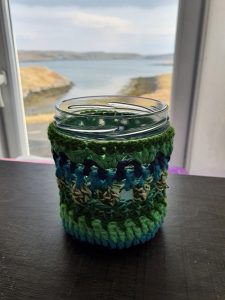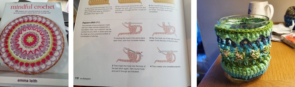 It was good to learn a couple of new stitches when doing her projects, like Popcorn stitch. I’m not sure if you can see the stitch on the tealight holder I made out of a glass jar… It’s a green and white bobble stitch which is made by crocheting 3 or more treble stitches into one foundation chain and then securing the bobble at the top with a slip stitch. (see the picture).